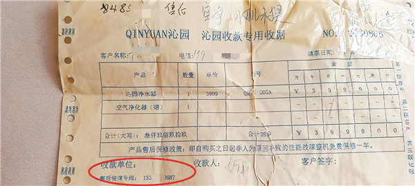去年11月,年逾七旬的谭先生在道外区景阳街黑天鹅家电商场以3999元的价格买了一台沁园牌净水器。今年1月末,他发现净水器滤芯的一盏指示灯灭了,于是根据商场提供的购物三联单拨打了净水器厂家售后电话“133####0687”,谁知却发现该号码是空号。由于处于疫情防控期间,加上个人感觉没有实质性影响,谭先生并没有太在意。