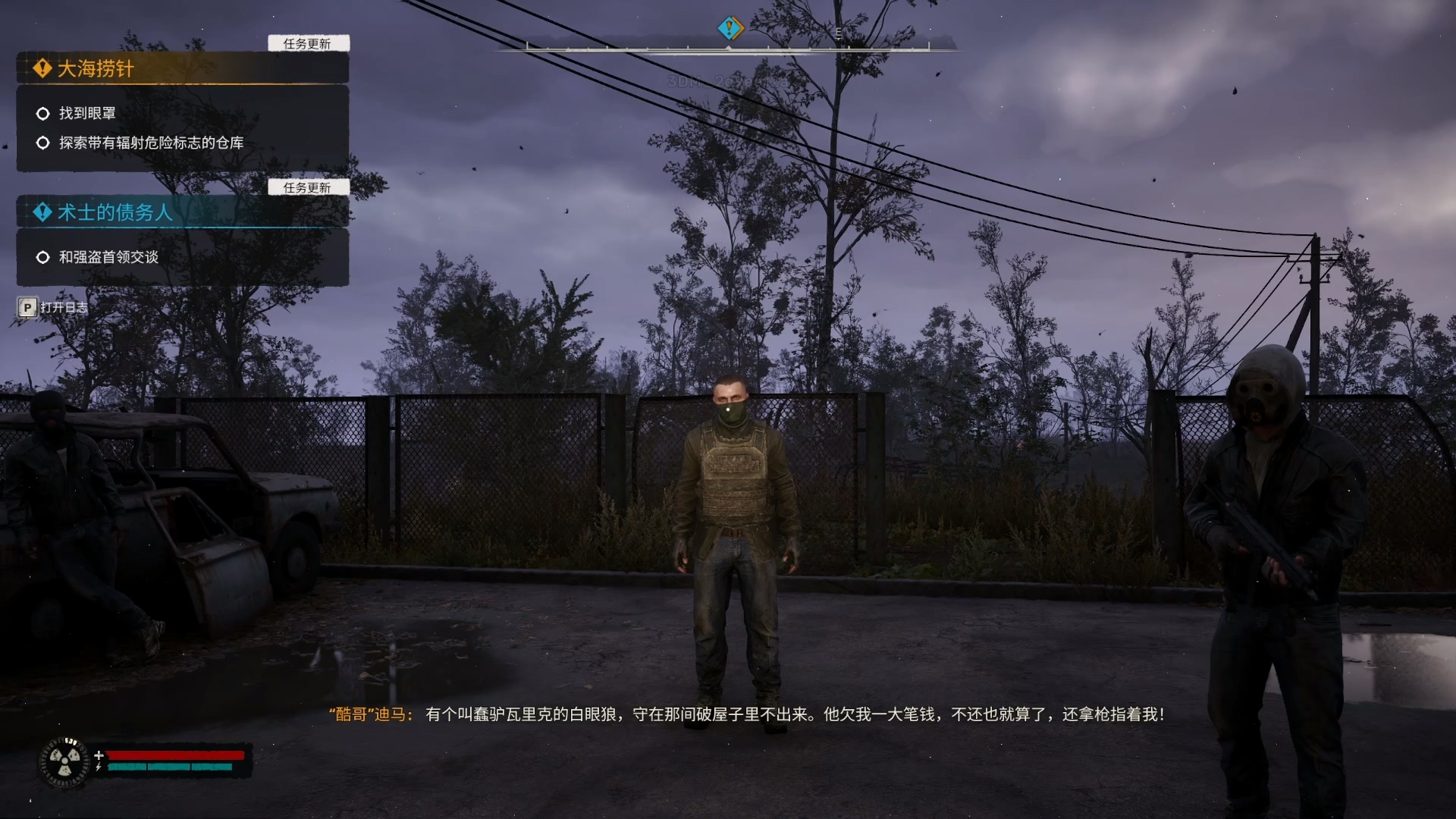 扎利斯亚的技术员“镜片”让我去找到獒犬带领的一支挖宝小队。他们去调查几个在死去潜行者的 PDA 中发现的旧储藏点了。镜片担心挖宝人可能在这些地点中了埋伏。他建议从獒犬和他的小队最后一次行动的地点开始搜索。