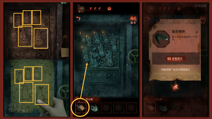 【女主视角】:根据男女主角所见的对应的线索,用【打火机】点燃对应的人物姓氏手中的蜡烛:【心、沖、柱、英、芮】,机关被打开,拾取【鱼形物件】
