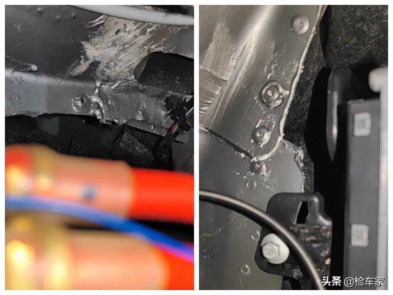 而且把后备箱盖板拿开之后可以看到有明显的烧焊的痕迹,还可以看到一个防撞梁的螺丝,当时都撞成这样了,防撞梁也肯定是保不住的。