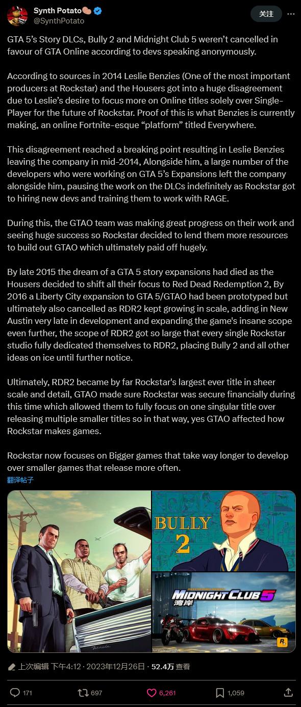 在推特上,一个名叫 Synth Potato 的媒体账号发布消息,声称从 R 星匿名开发者处听闻了最近被发现的已取消的《GTA 5》单人剧情 DLC、迟迟未开发的《恶霸鲁尼2》以及《湾岸午夜俱乐部5》并不是因为《GTA OL》在线模式,而是因为一些重要开发人员离职才被取消的。