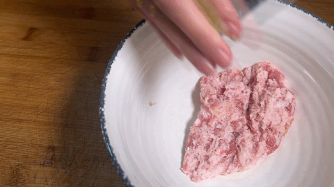 13. 将切好的香菇丁倒入肉馅中,用筷子搅匀备用