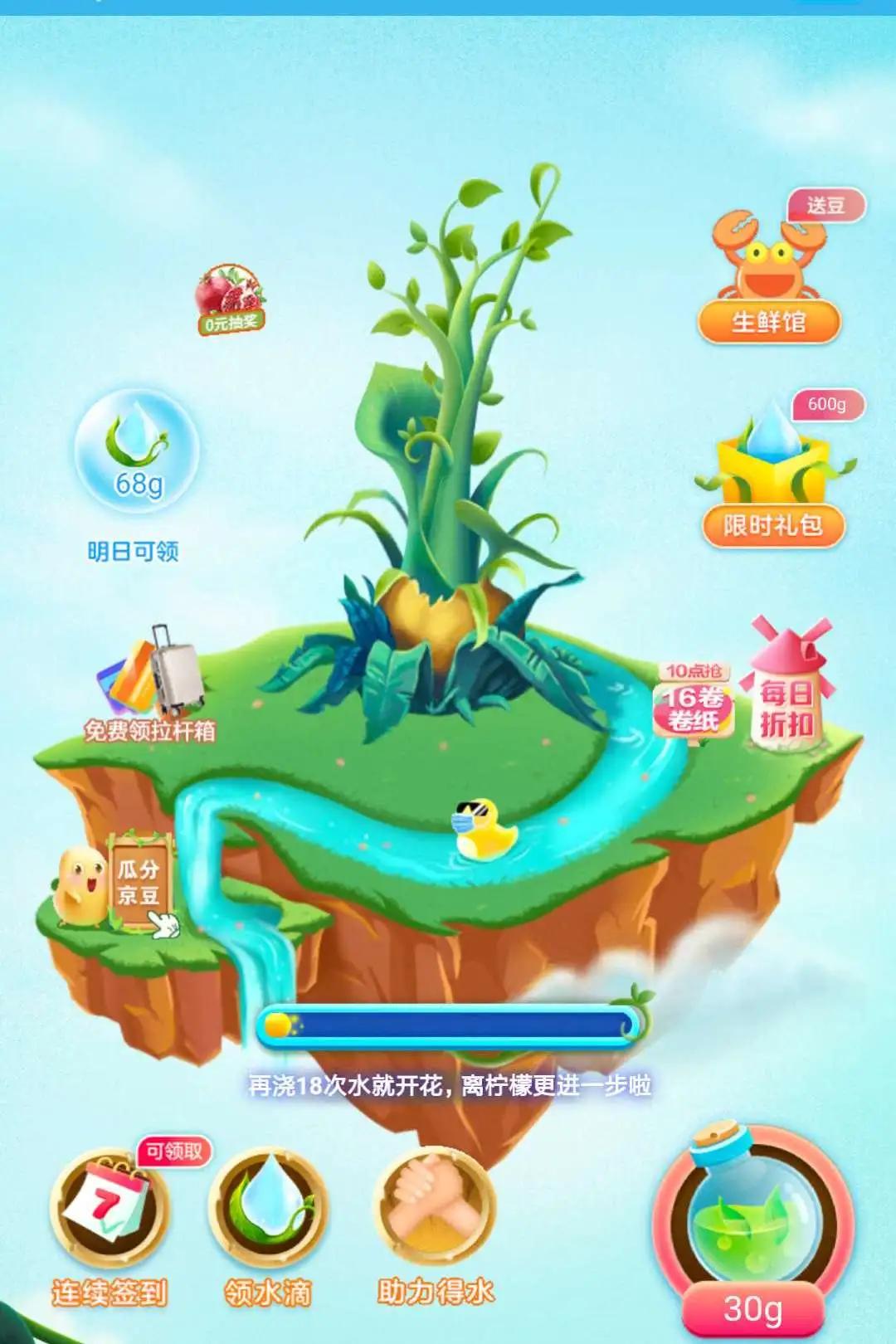 领水滴每日首次浇水:每天第1次给果树浇水,可以获得10g水滴,需点击领取;