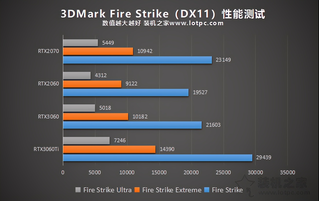 在3DMark Fire Strike(DX11)测试中,能够看出RTX3060的性能比较接近RTX2070,RTX 3060的性能要落后RTX 2070显卡大概7%左右。