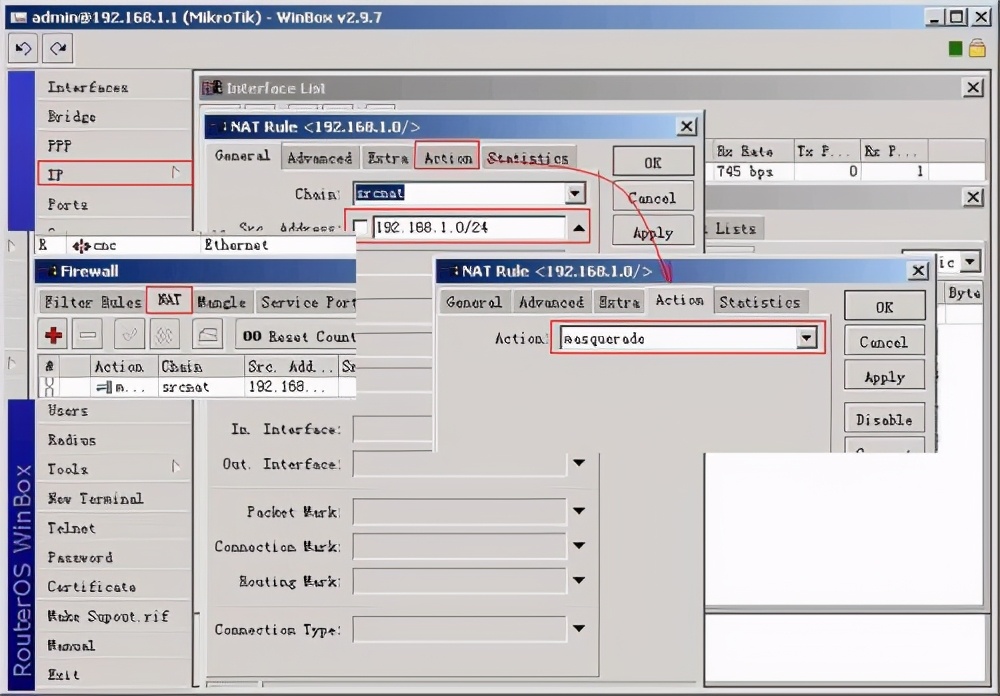 (4)IP->FIREWALL,NAT选项卡,+号添加chain:srcnat,src.addr:192.168.1.0/24,ACTION选项卡里为masquerade.OK,现在可以通过电信上网了