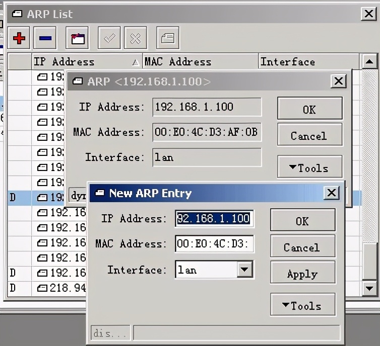 4、IP arp(这里是网卡mac地址与ip地址绑定,我是绑定了),具体操作,双击前面带D(代表未arp绑定)的IP地址,点tools选择copy,点OK,哈哈,前面的D就没啦,恭喜你绑定成功。