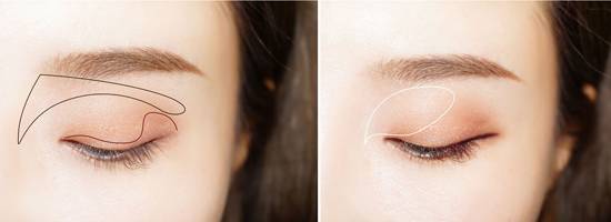 第三步:浅棕色眼影用大号晕染刷沾取,均匀刷在整个眼窝处。棕色眼影涂抹在双眼皮褶皱内,具体范围如图所示。
