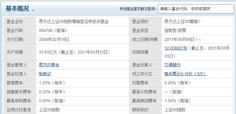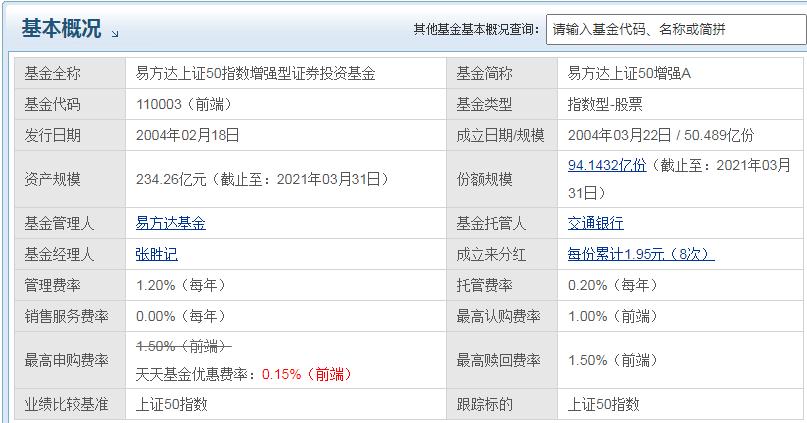 易方达上证50增强A:费用=10000*1.2%+10000*0.15%+10000*0.2%=155元