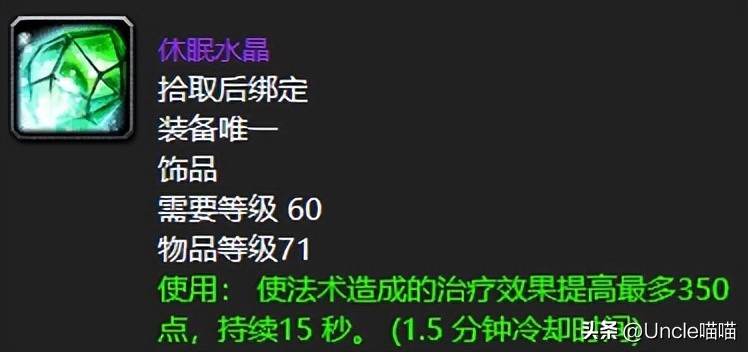 辛特兰绿龙伊森雷德荣誉出品的休眠水晶,喵叔我想部分普通玩家可能见都没有见过,毕竟野外世界BOSS可不是一般团队能够染指的,所以不知晓这款恐怖如斯的治疗爆发饰品休眠水晶也是情有可原。