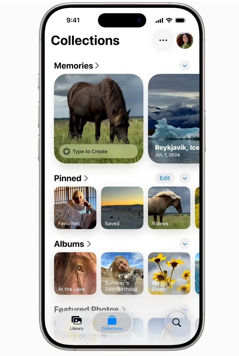 照片 app 的布局也进行了调整,通过独立标签页呈现图库和精选集视图。