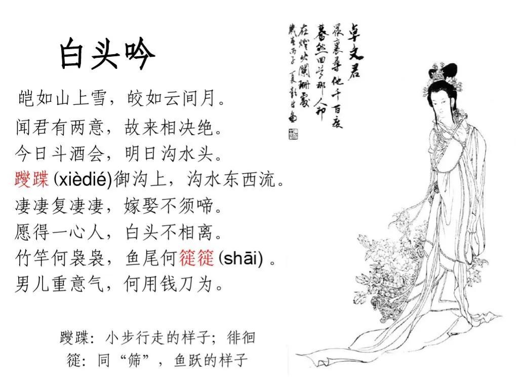 后来世人流传的“白头吟”,据传也是卓文君收到信后伤心所做“愿得一人心,白首不相离”。