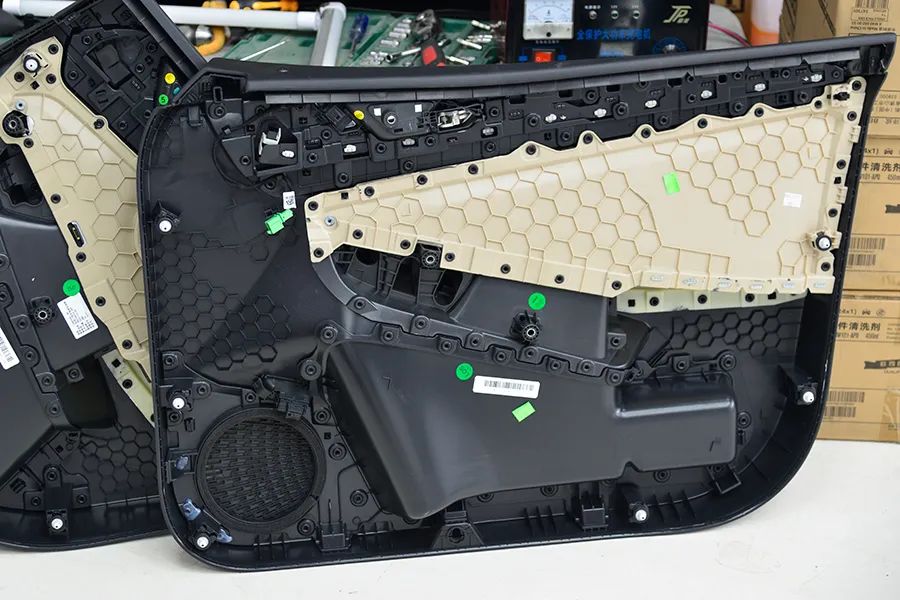 拆掉车门内饰板,使用了塑料材质密封板,所有孔位都进行了密封。这是因为前门有辅助气囊更快更准弹出的气压传感器。