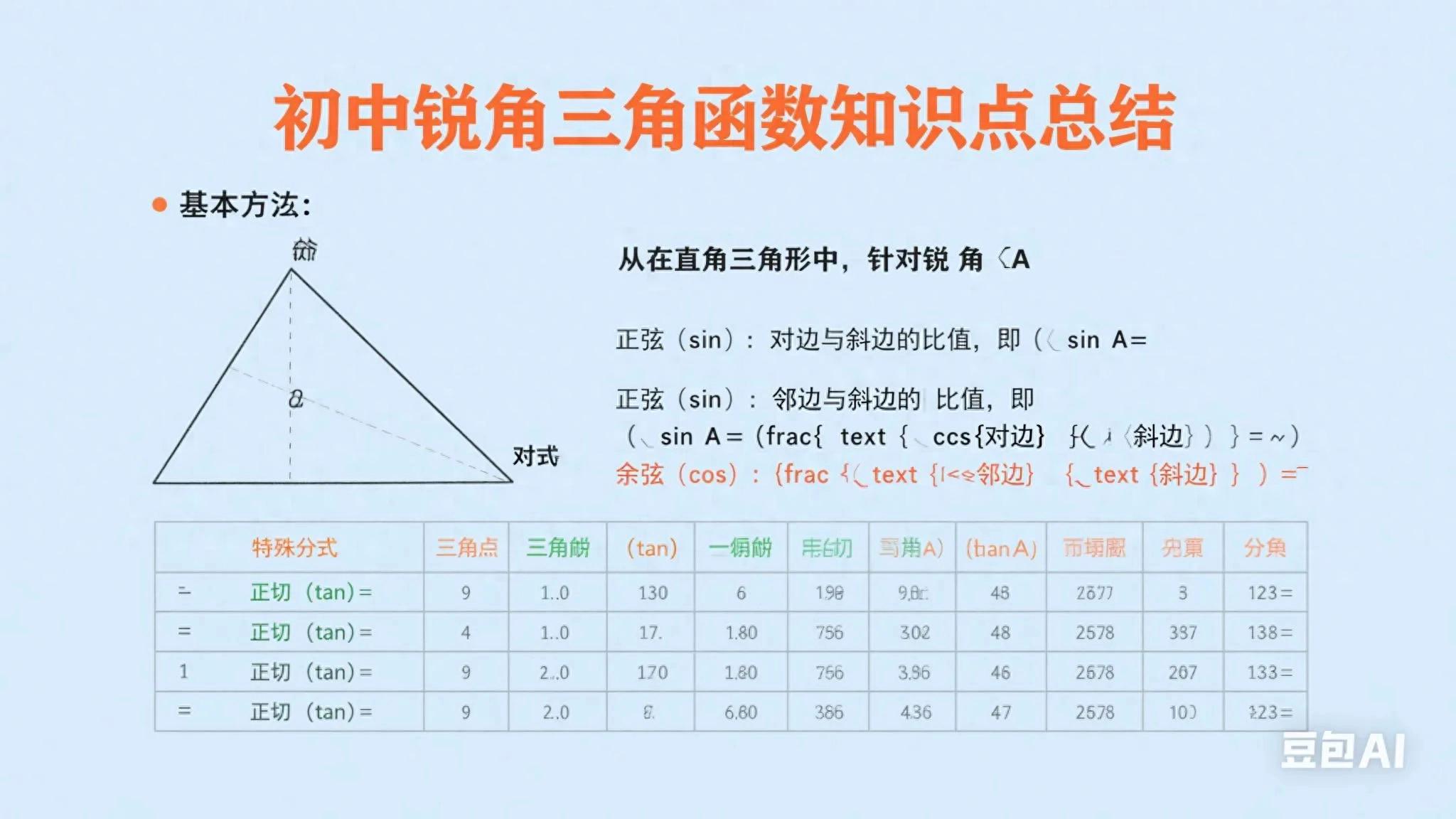 - 余弦值与正弦值顺序相反,正切值对应\(\frac{\sqrt{3}}{3}\)、1、√3。