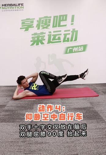 动作四:仰卧空中自行车。用腹部的力量把肩膀和上背抬起,转动上身,手肘去碰对侧的膝盖。一组20个,做2组。