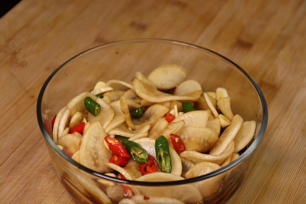 4、将切好的蒜和辣椒放在煞过水的萝卜里面