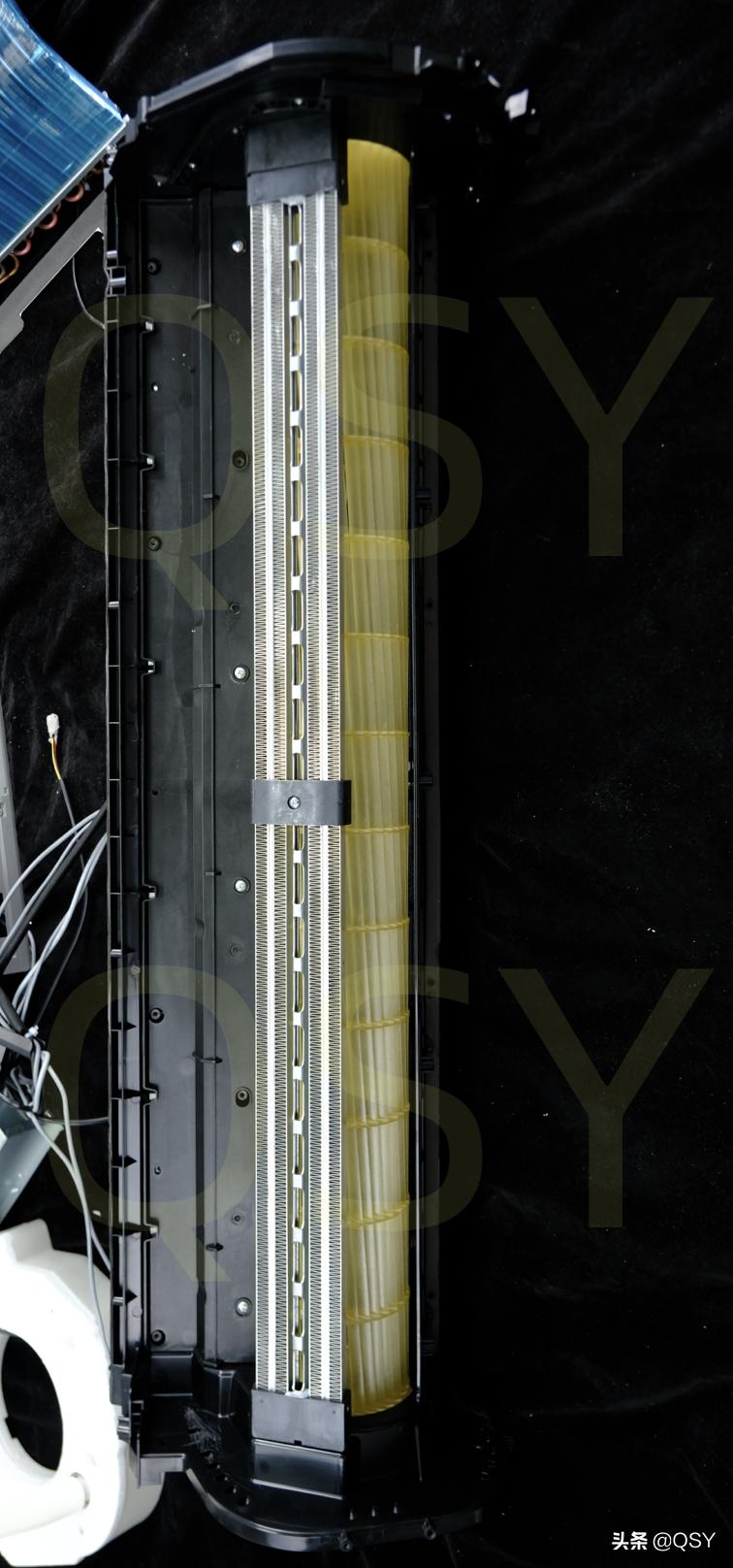 米家新风3匹柜机,拆下蒸发器后,可以看到电辅热和贯流风扇,电辅热功率是2300w