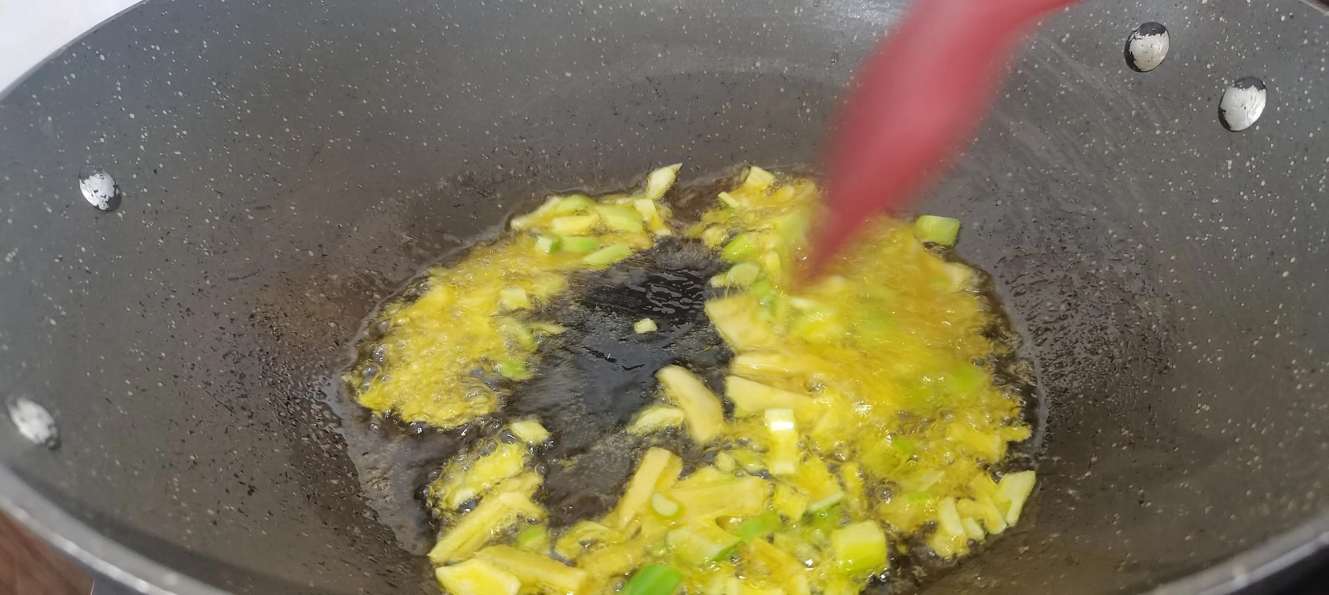 再加入章鱼足,大火翻炒,炒30秒,然后出锅