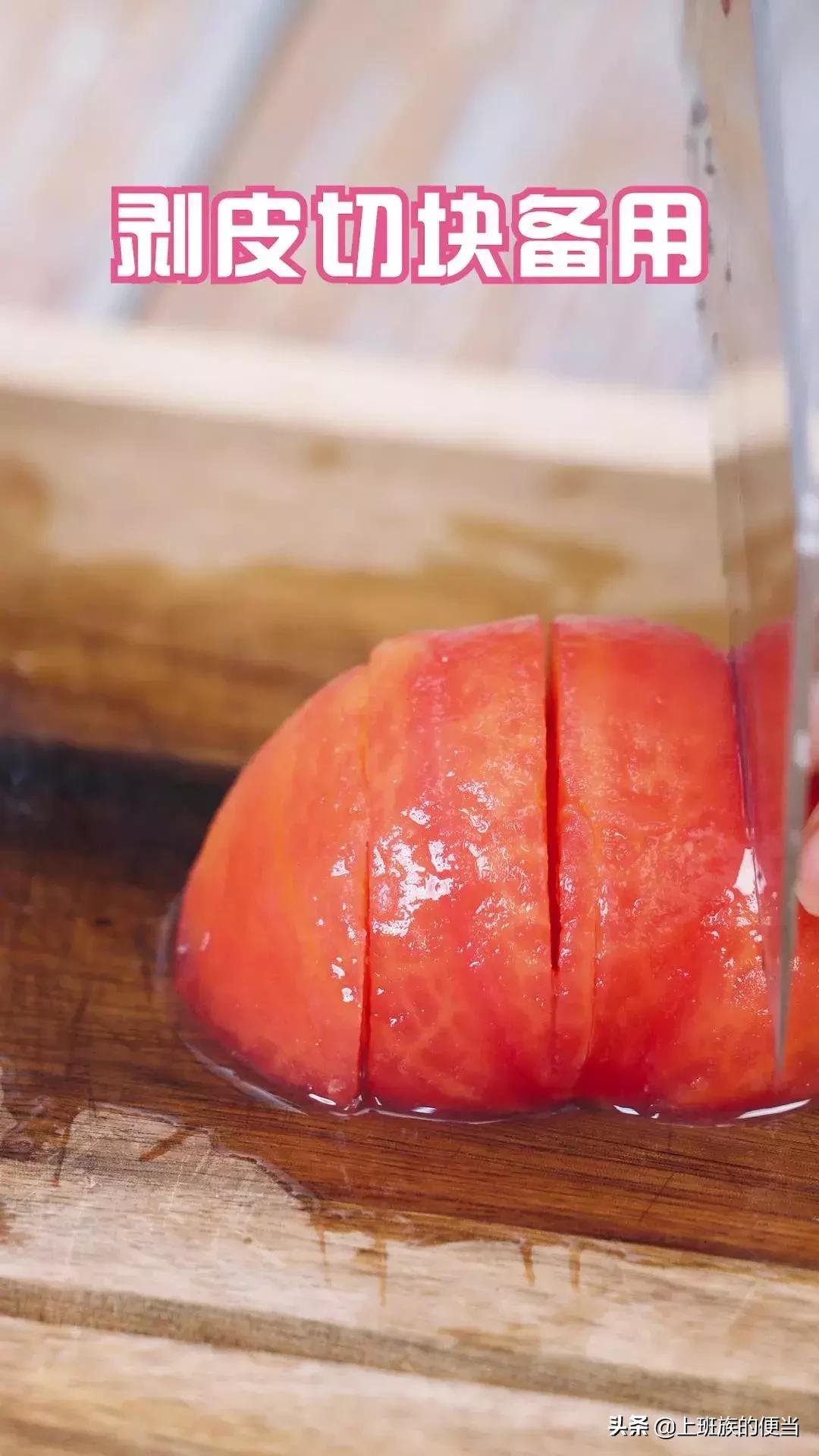 这个时候我们来处理西红柿,将西红柿洗净,表皮划十字,放入盆中用开水烫一下;