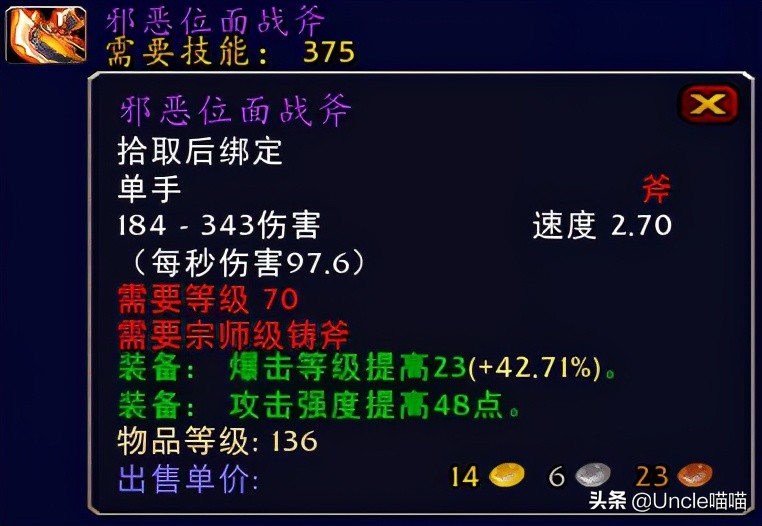 时光荏苒,魔兽世界怀旧服已经进入了P6阶段,而我们的玩家也在纳克萨玛斯之中夜以继日地奋斗着,只为了那属于我们的特殊荣耀!一路走来,你是否已经攻克了我们60版本最强的NAXX了呢?还是说你依旧在为着那份久违的荣耀而奋斗,无论如何,我们也一路带着情怀走过了这一段看似漫长的旅程,而魔兽世界的历史长河已然悠久,那么今天旧让喵叔带大家一起再次去回忆一下那些年我们钟爱的武器之“单手斧篇”。(由于喵叔个人时间关系,只简单地回忆几把单手斧,因为TBC后个人感觉美工直线下降,所以本篇内容统计截止TBC时代,如果你要是想起来我遗漏的经典也可以在评论区留言与喵叔分享哦,谢谢!)