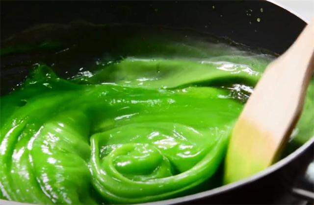 7.锅中水开后关火,倒入菠菜汁,再开大火炒成稠糊状。