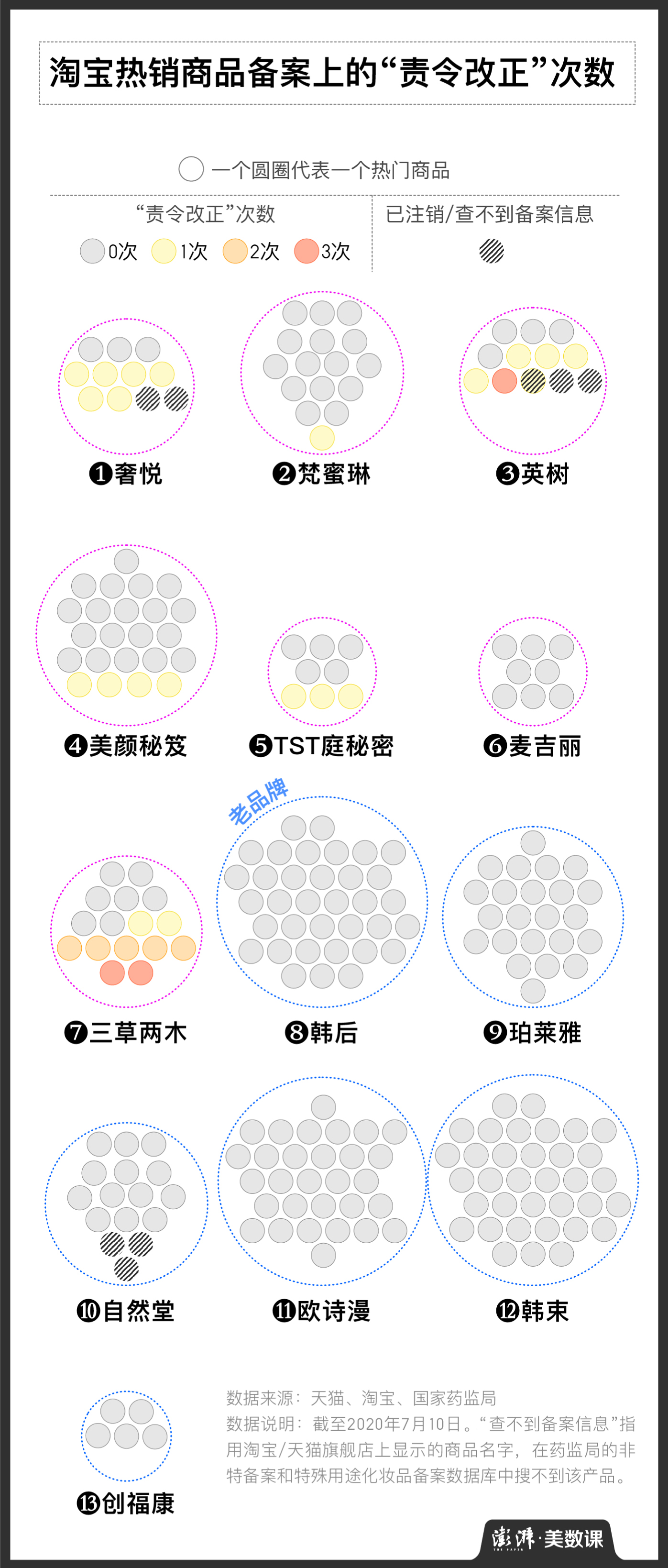 上图中有颜色的圆圈代表了产品备案上记录的“责令改正”次数。可以看出,与老品牌的干净相比,新品牌的问题次数出现得更加频繁。