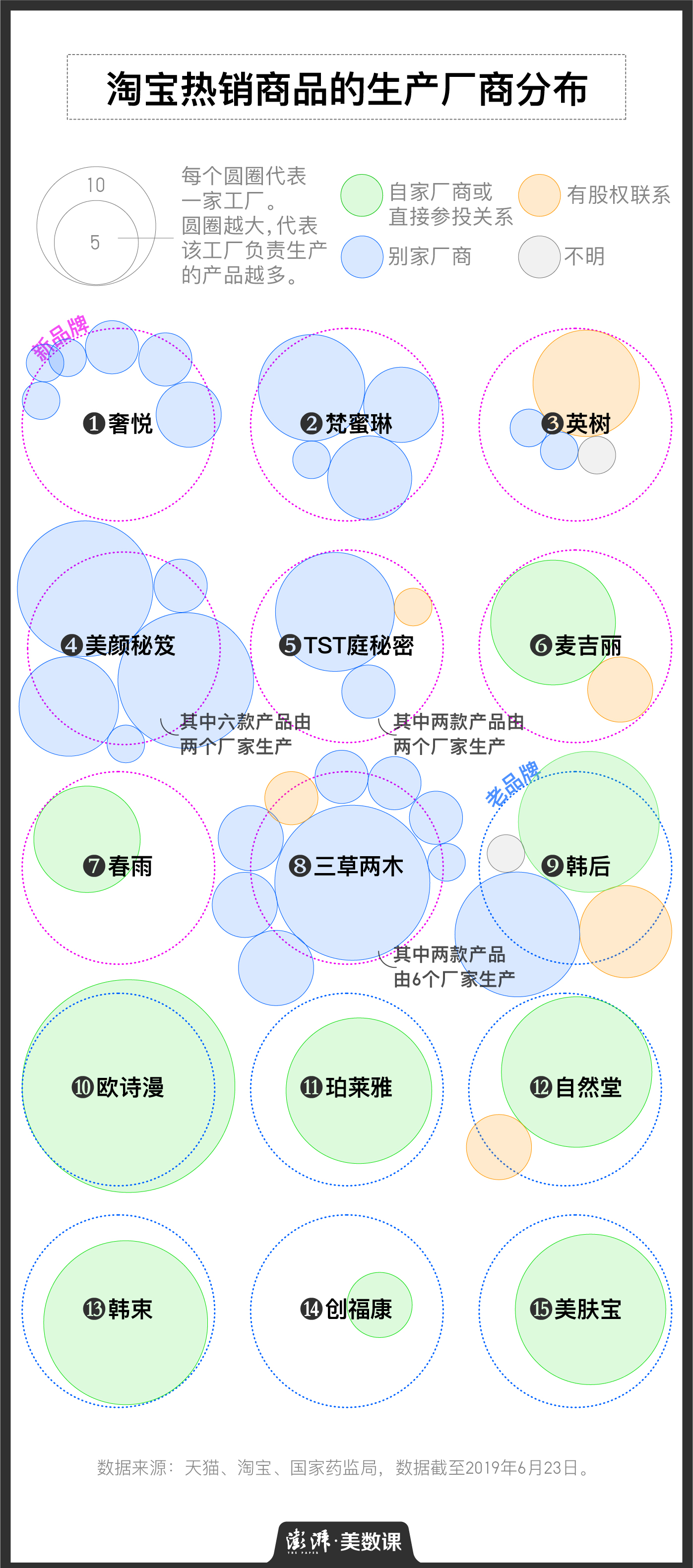 新品牌则更愿意把产品承包给外部厂商。比如奢悦、梵蜜琳和美颜秘笈的生产商,和这三个品牌的母公司都不存在股权联系。生产商分散得最多的还是三草两木,旗下的两款热销产品分别在6个厂家生产。