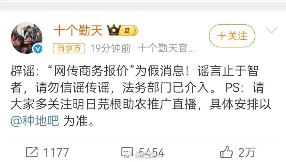 随后,十个勤天官方账号紧急辟谣,说网传商务报价为假,具体要以节目方种地吧公布的为准。