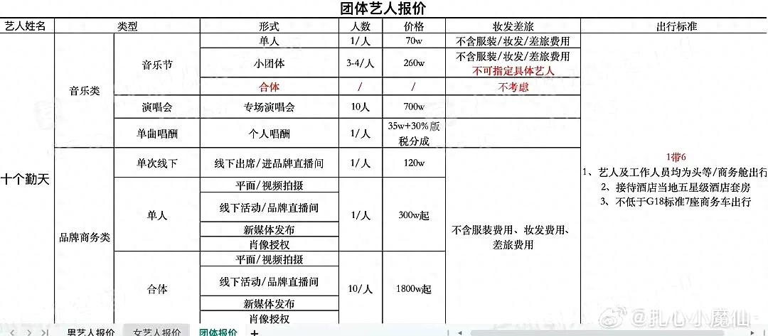 近日,有网友曝男团组合十个勤天商务报价,还列出一张表格。