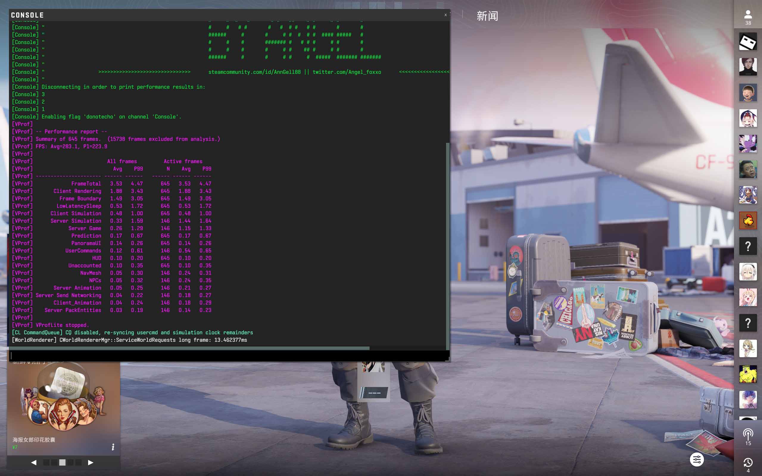 ● 平均帧数为283.1,P1为223.9。