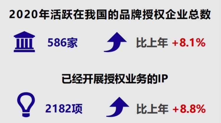 截至2020年12月,按照企业实际开展授权业务的口径统计,活跃在我国的品牌授权企业总数为586家,同比增长8.1%,已经开展授权业务的IP为2182项,同比增长8.8%。