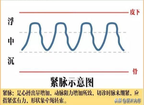 如《脉经》说到:“紧脉,数如切绳状。”宋代朱肱《活人书》云:“紧,按之实数,似切绳状。“张介宾《景岳全书·脉神章·通一子脉义》曰:“紧脉,急疾有力,坚搏抗指,有转索之状,”并且指出:“凡寒邪外感,脉必暴见紧数。”张前辈明言道“紧脉急疾有力”,疾就是快的意思。又特地指出外感寒邪“脉必暴见紧数”,意在强调紧脉就是脉率快而脉形绷急。