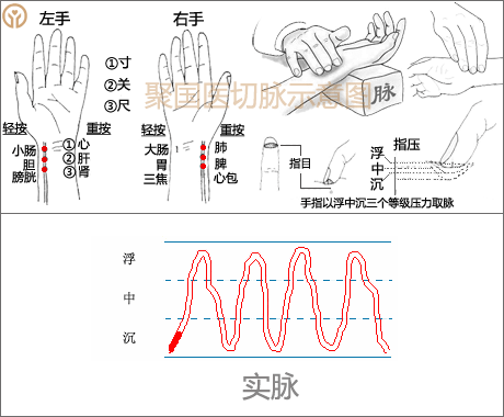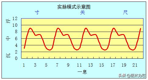 实脉的脉象特点是脉搏搏动有力。寸、关、尺三部,浮取、中取、沉取三候均充实有力,应指幅幅,且脉形宽大而长。