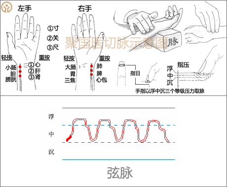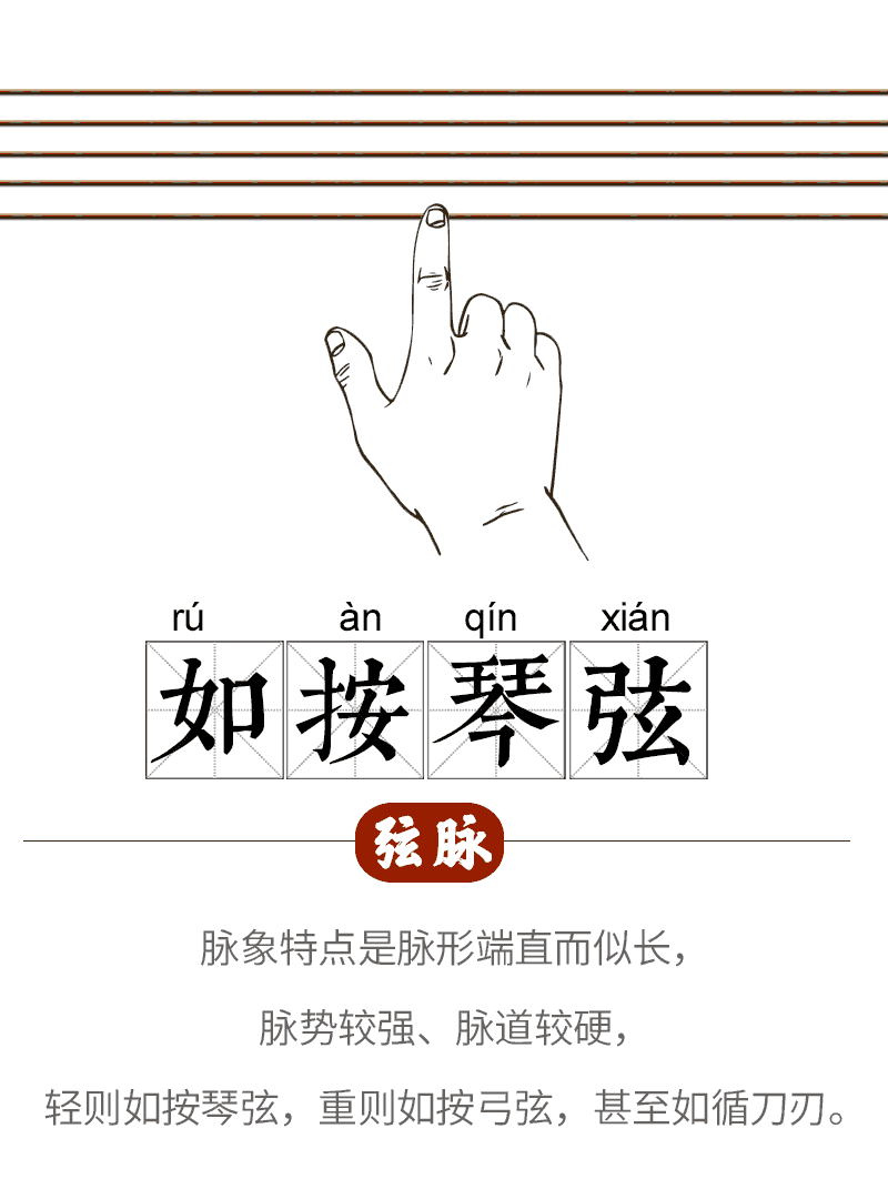 其脉的紧张度大,如按在绷紧的琴弦上。其弦硬程度随病情轻重而异,轻则如按琴弦,重则如按