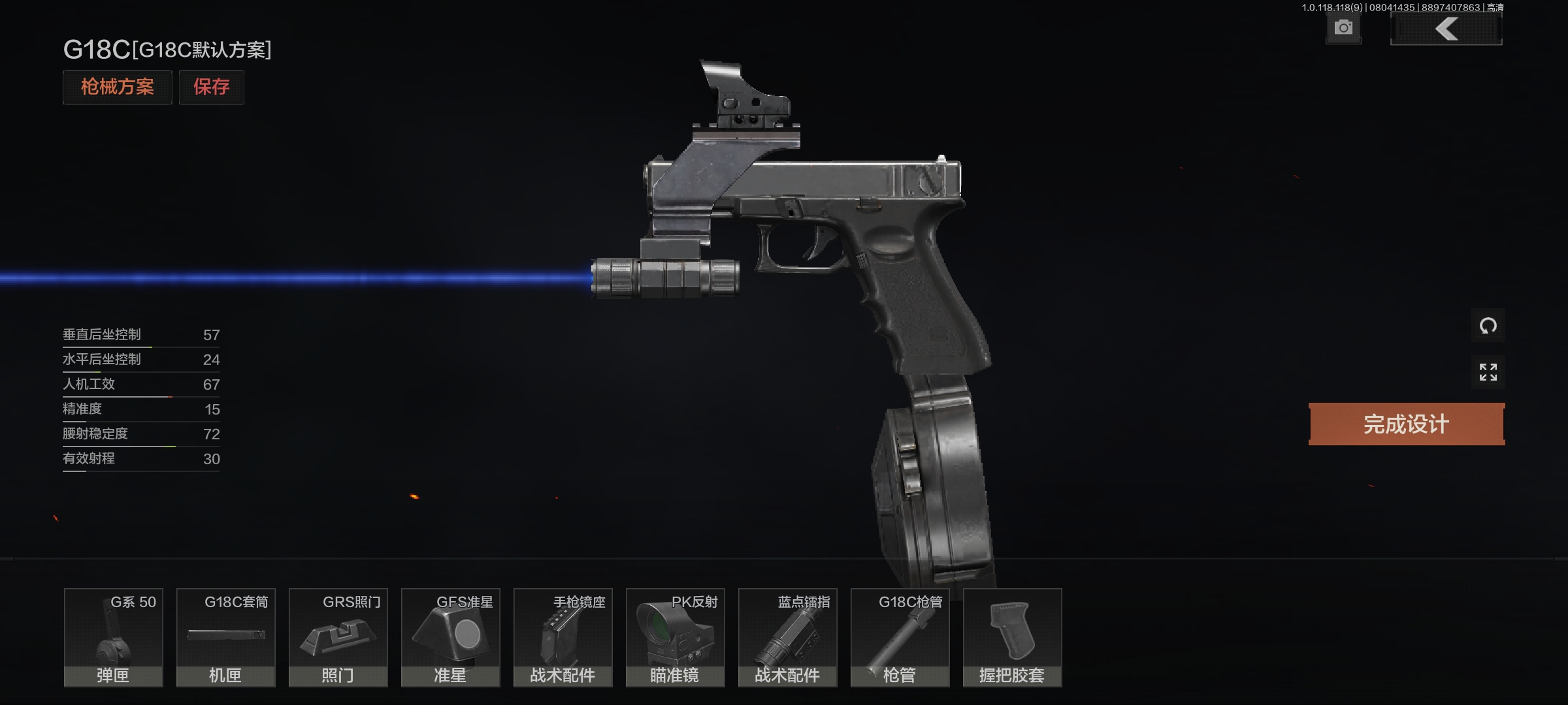 改装也很简单,50发大弹鼓,一个pk反射,一个镭射辅助瞄准。这一套下来3w多,价格一般看G18C主枪在市场卖多少钱,反正就贵在枪本身。
