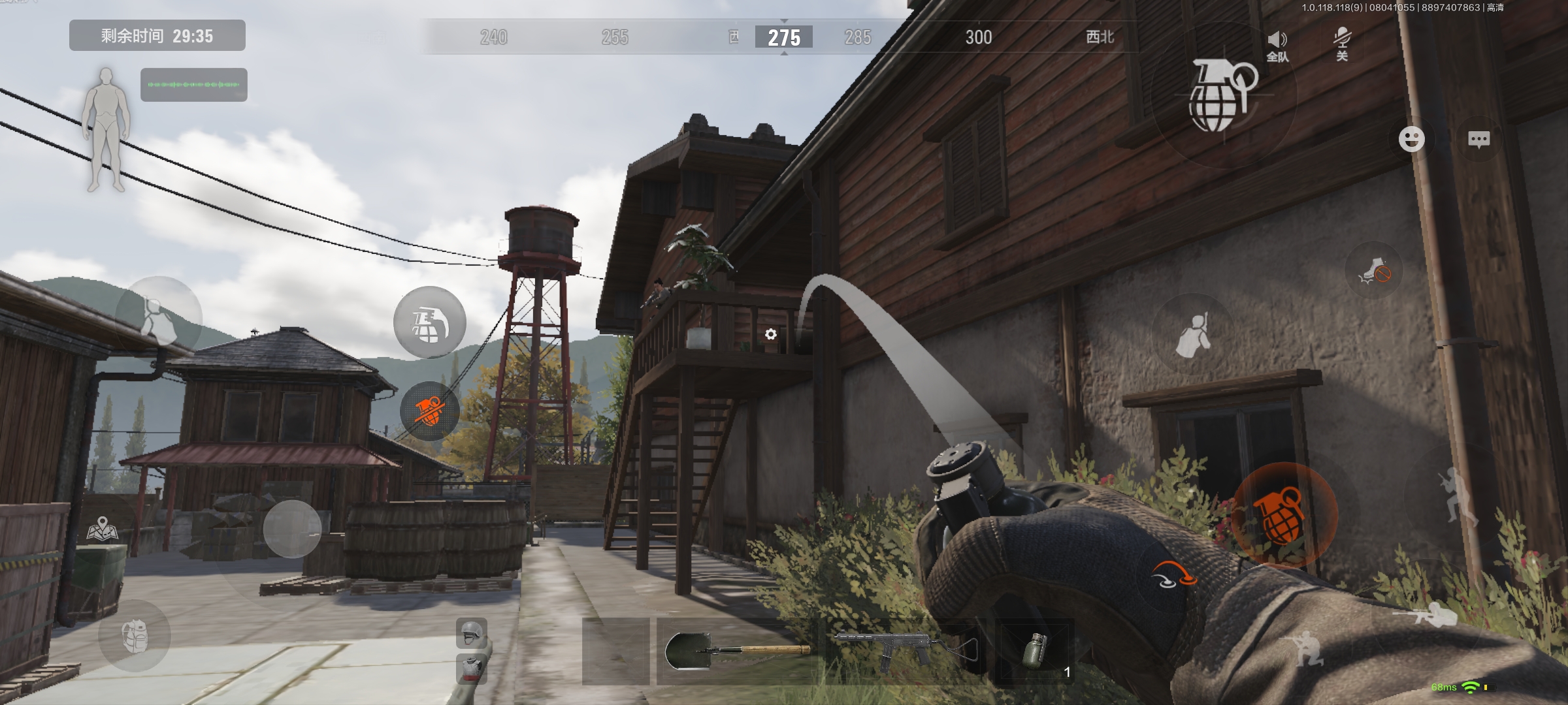 当我们来到别墅附近,如果开局是出生在仓库以及高速公路附近,我们跑到别墅的时候,先躲在上图的位置附近听一下楼上有没有脚步声,如果有脚步声,我们就通过窗户往二楼灌雷或者催泪弹。