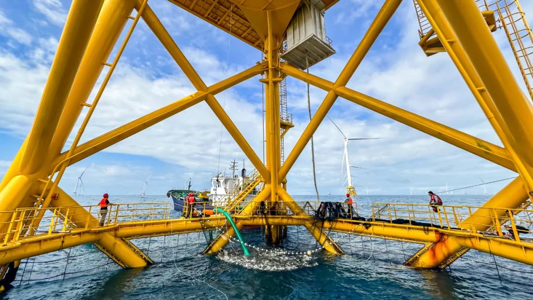 今年8月,“明渔一号”整体建成后随即开展金鲳鱼深远海智能化养殖,它首创性实现了“海上风电+海洋牧场”海域、结构、电力、信息传输、运维等多方位的深度融合。这是全球首次实现绿电一体化直供养殖的低碳渔业模式,不仅满足了深远海养殖设备对自动化和智能化的电力需求,也实现了风渔深度融合技术、网箱抗台风技术、深远海智能化养殖技术的突破。
