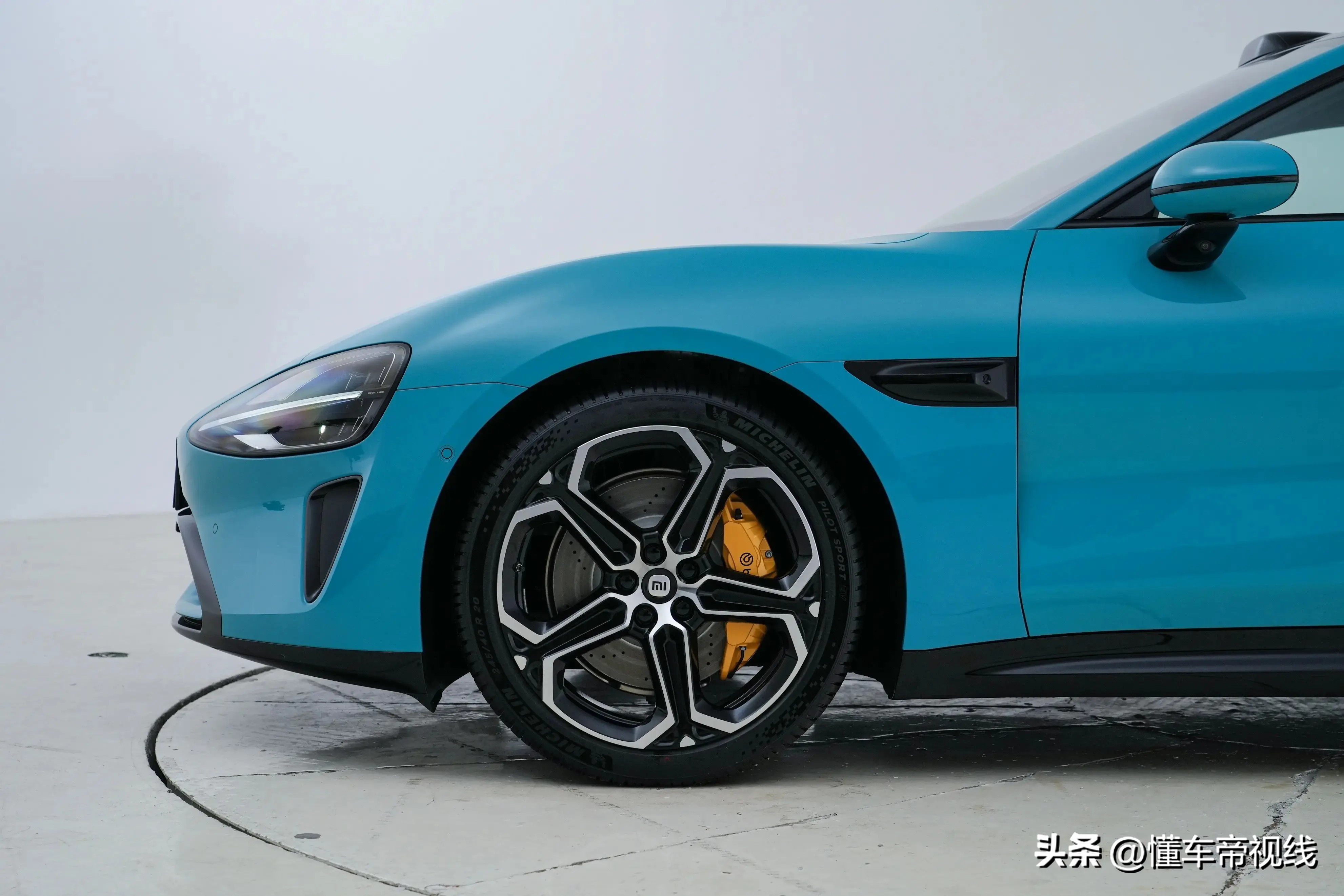 小米SU7侧面设计有隐藏式门把手,并提供有梅花轮辋、米其林PS系列高性能运动轮胎、布雷博刹车卡钳以及打孔刹车盘等,展现出较强的运动风格。此外,在外后视镜下方和前翼子板位置还配备有摄像头。