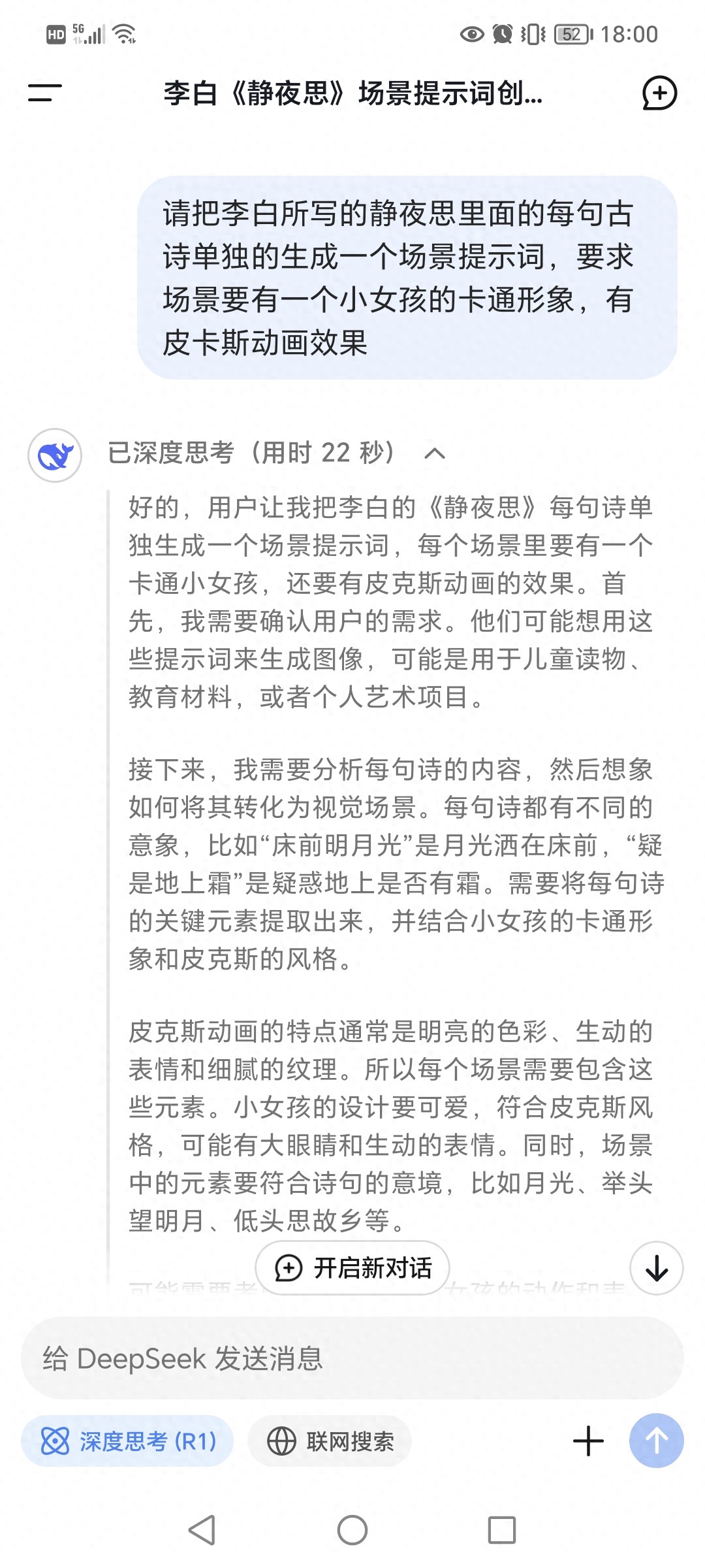 例如李白静夜思,将相应的要求输入DeepSeek提示框,点击发送,DeepSeek就会根据指令要求生成相应的提示词(我写的比较简单,差不多20秒左右就完成了),提示词生成后,将每一句古诗对应的提示词内容复制出来
