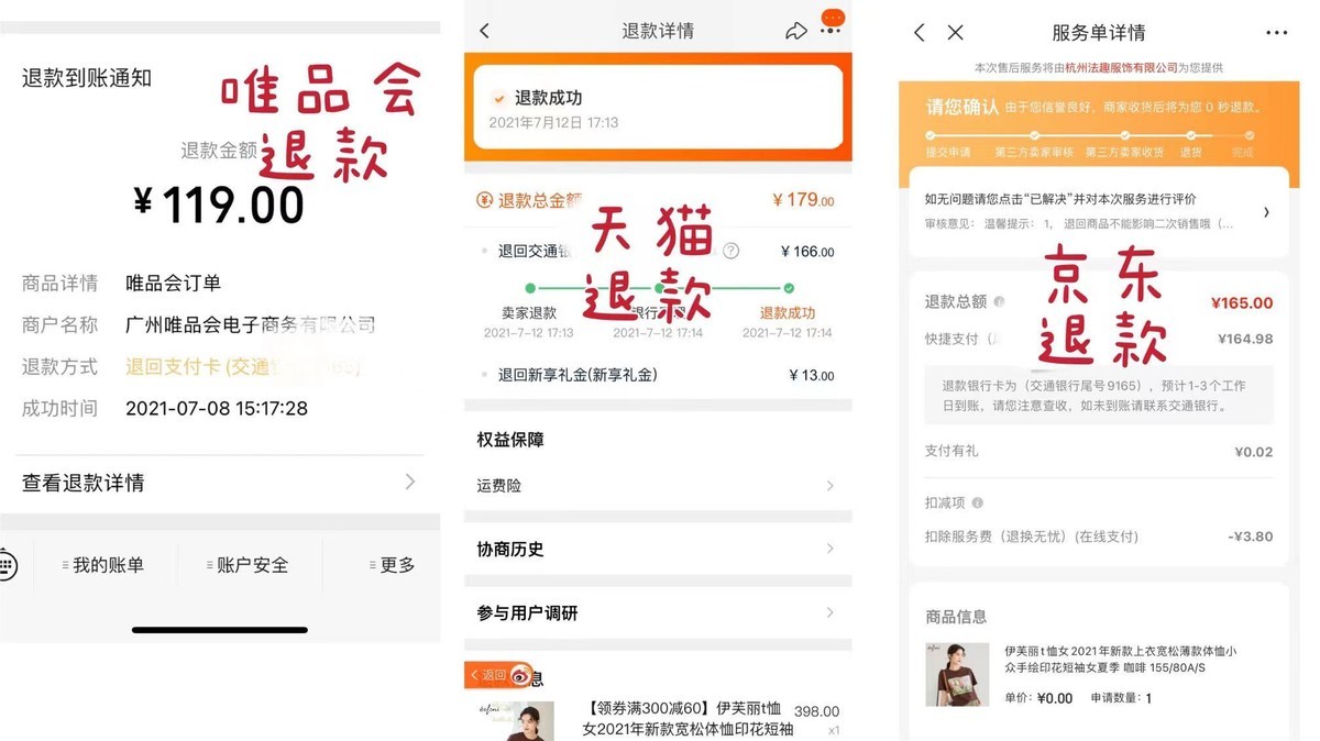 此外,三大平台的退款到账时间和金额也不尽相同,品牌特卖平台唯品会的退款到账时间更快,无损失金额;其次是天猫,但换货和退货后消费者将损失11.93元;最后是京东,消费者损失金额为11.82元。这一专业测评,实力上演了什么是“没有对比就没有伤害”,而坚持品牌特卖的唯品会也利用“免费退换”服务,为消费者提供了更安心的购物体验。