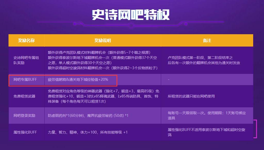 网吧特权,可以为玩家们提供20%的地下城通关经验,也是一个高额的提升,还是那句话,你不是只通关一次两次,而是很多次,20%的提升是在经验药的基础上进一步进行增幅,虽然是加法计算,但是这个提升毋庸置疑是极高的。