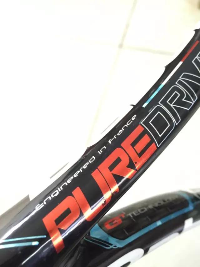 看PURE这几个字母,通过两把球拍的对比,我们可以看到2号球拍的字母颜色明显比1号球拍的字母颜色要深,并且2号球拍图案切割粗糙,我们仔细观察U和R两个字母之间的涂装,1号球拍的分割明显,界限清晰,干净利索,但是2号球拍几乎看不出分界,混乱的很!可以看出,2号球拍的涂装很粗糙。也许有人说这是拍摄角度和光线的问题,那么好,我们把两把球拍并排来看:
