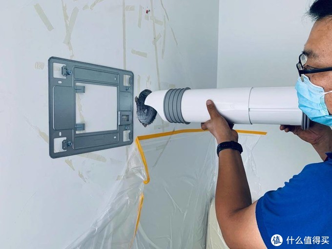 因为要在墙面墙体中打出直径210mm左右的管道孔,所以会爆出大量的灰尘,这里米家标配的打孔防尘袋就派上了用场,把它贴在风道孔中央即可,然后打出的灰尘便会自动收集进集尘袋了。