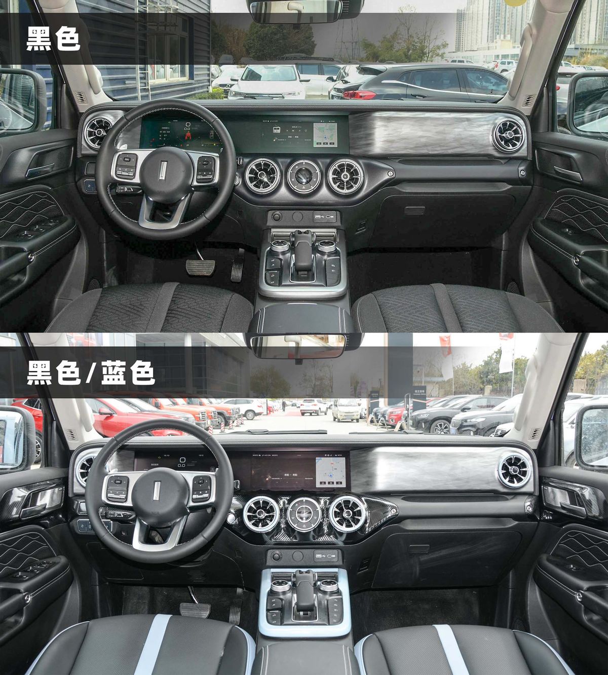 内饰配色上目前坦克300有黑色和黑/蓝混搭两种方案可选,但是同样只有顶配的致敬莫奈限定版才拥有蓝色内饰,其他车型均为黑色。设计语言上全系所有车型依然保持着一致,圆孔形空调出风口十分硬核,贯穿式大屏则点缀出了几丝科技感,类似于航空推进器的电子挡把还引用了一些外骨骼装饰,真的十分讨喜。用料上坦克300完全能够匹配上豪华品牌车型的定位,中控台和门板处均使用了大面积的皮革缝线设计,以及软性材质包裹,而副驾驶中控台上的拉丝饰板,和车内大量的镀铬材质,则进一步提升了内饰的精致感。