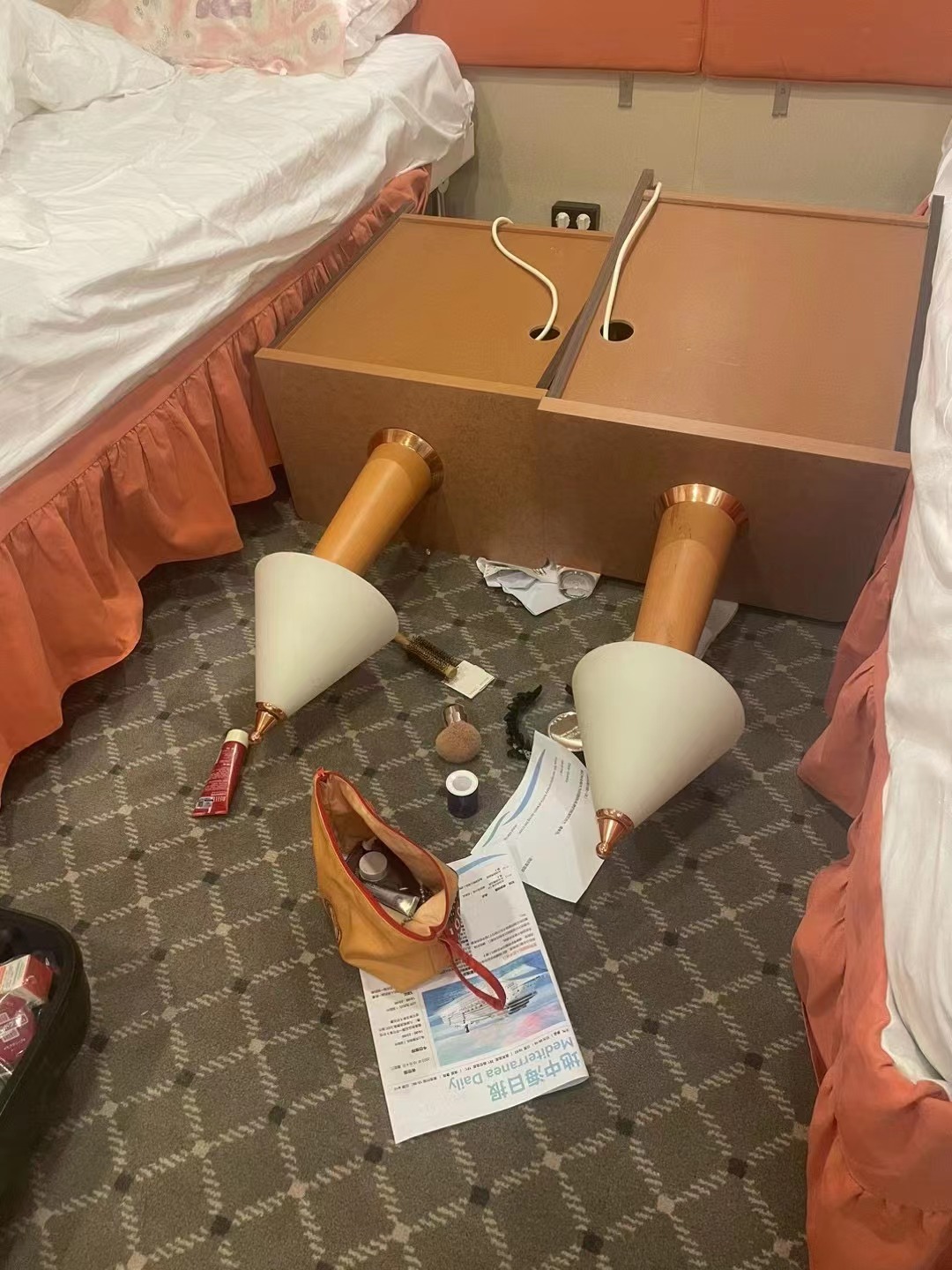 不过,10月6日乘客又遭遇了新状况。凌晨1点左右,邮轮船体突然大幅倾斜,睡梦中的沈先生被晃醒,邮轮房间桌子上东西全都掉在地上,还有乘客直接从床滚到了地上,船舱一片狼藉。