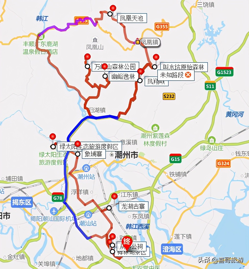 3、一次性自驾游玩潮州市潮安区以上值得游玩的景点,推荐行程路线:潮州市潮安区-梅林湖景区-从熙公祠-龙湖古寨-象埔寨-绿太阳生态旅游度假区-凤翔峡-叫水坑原始森林-凤凰天池-幽峪逸林-万峰山森林公园-潮州市潮安区。