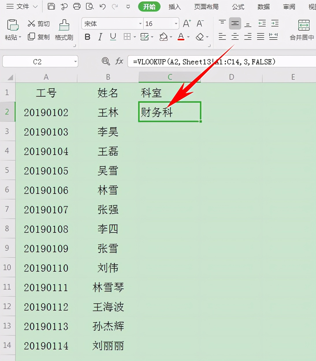 然后在单元格当中输入VLOOKUP函数公式,如下图所示,3代表科室存在于表2的第三列,FALSE代表精确匹配: