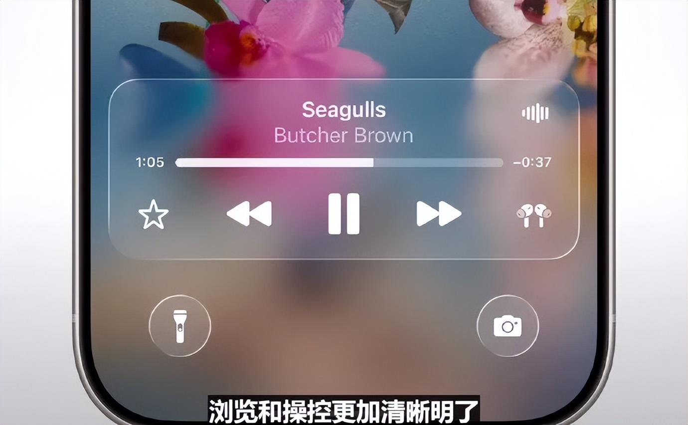这种革新也包括玻璃边缘和响应方式,动画效果可以与播放控制在屏上巧妙互动。