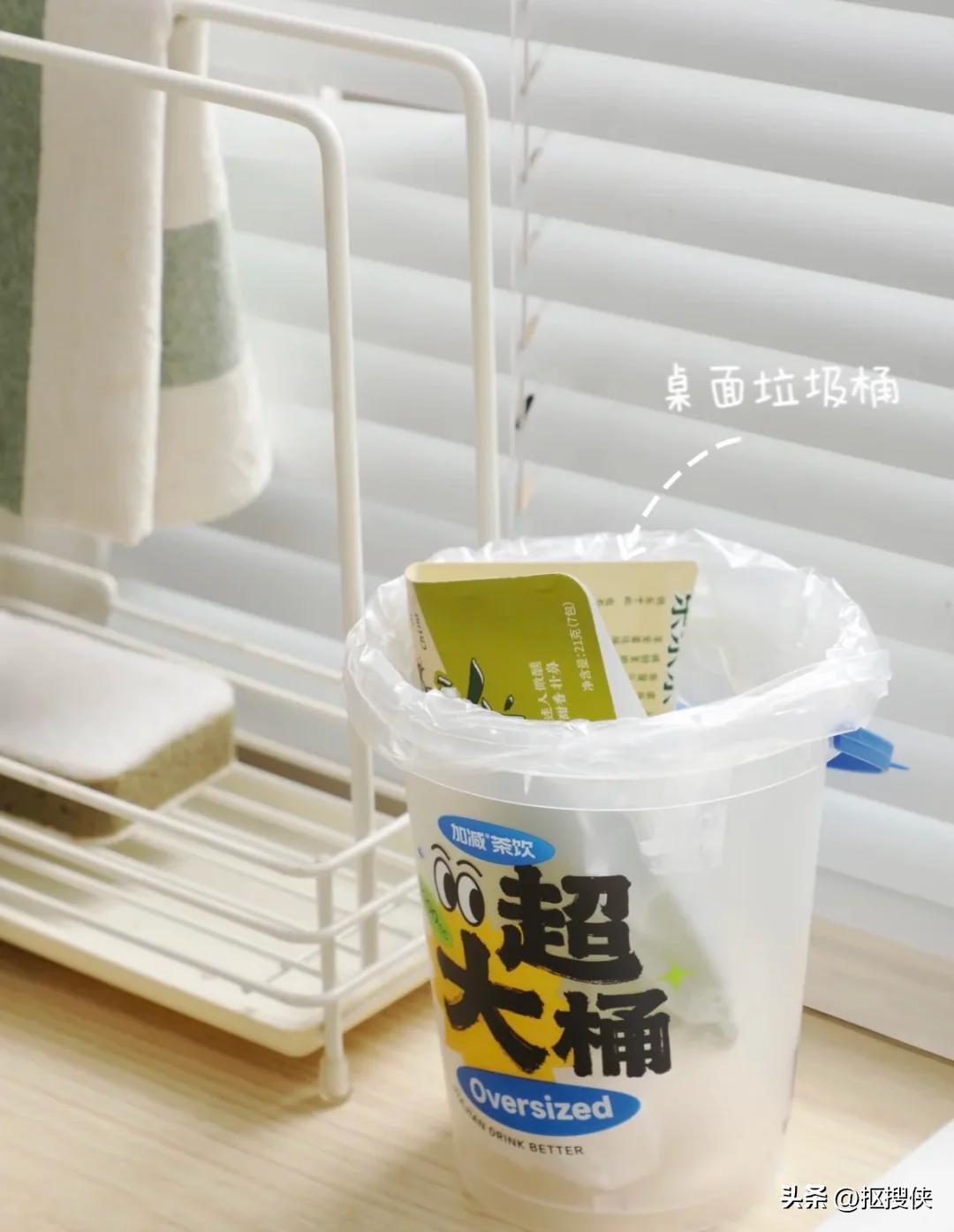 大桶的奶茶桶还能放在桌面当做一个垃圾桶,套上一个小袋子能收纳一些小的垃圾,顺手就放在里面了,很方便。