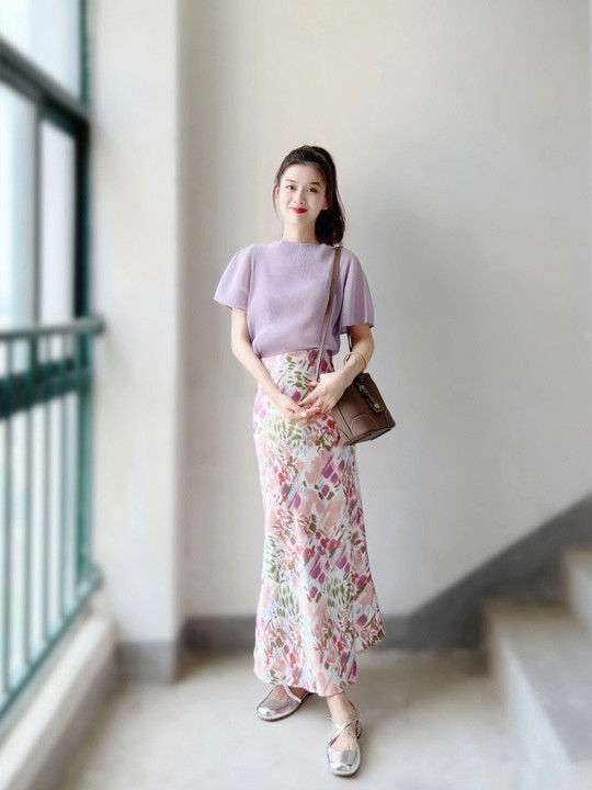 如果不喜欢背带裙,大家在日常可以尝试A字裙或是鱼尾裙等半身裙。比如这条色彩鲜艳的花朵鱼尾半身裙,对比A字裙,鱼尾裙会在小腿处有一个外括的版型,在走路上会更加方便。这条半裙的垂感也很好,所以衬得小姐姐身形越发修长纤细。