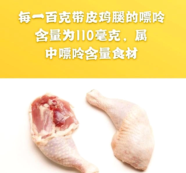 ●而每100克带皮鸡腿儿的嘌呤含量为110毫克,属于中嘌呤含量的食材。